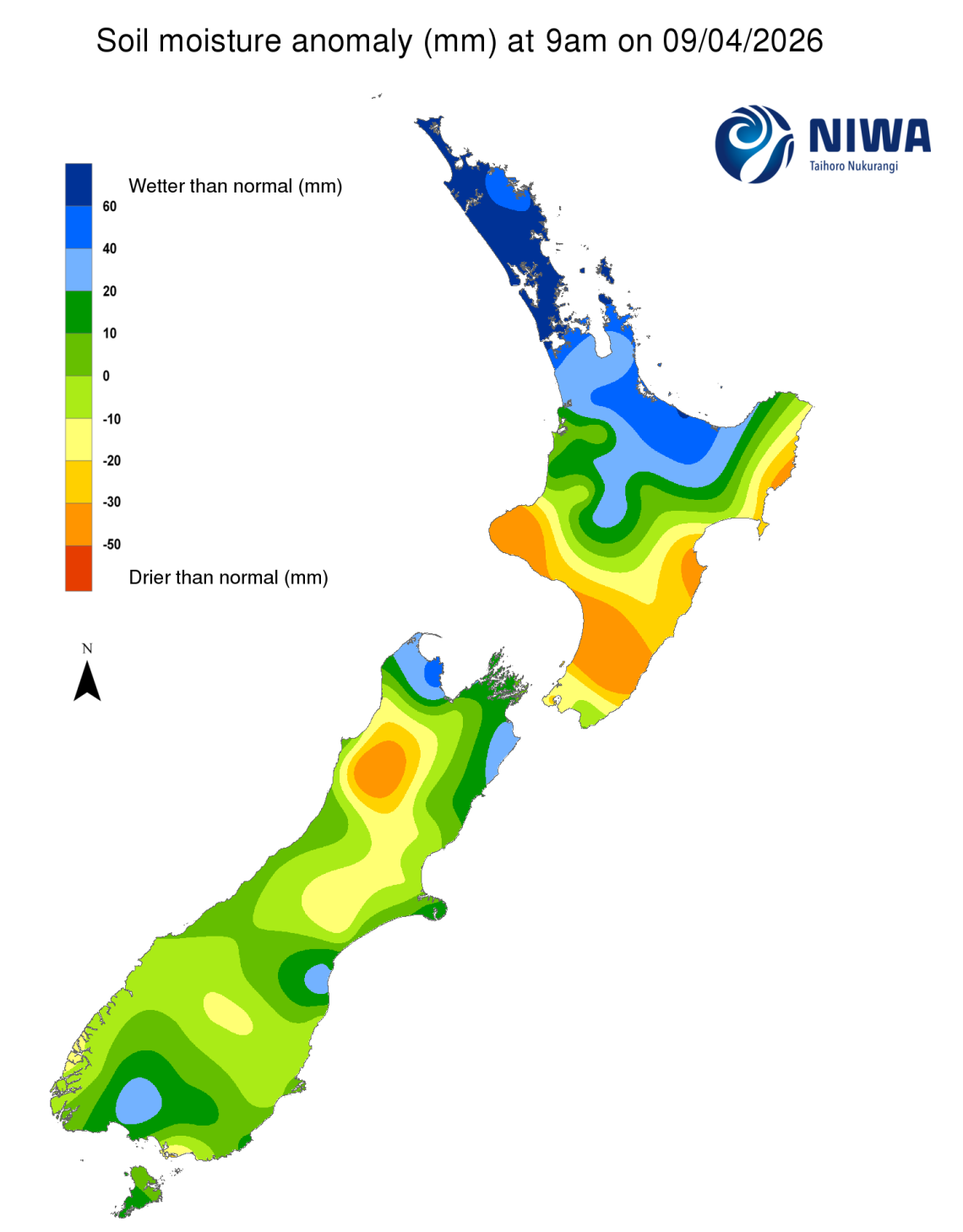 As of 7 April, the New Zealand Drought Index (NZDI) map shows abnormally dry conditions along the coast of the Horowhenua District and about Napier in Hawke’s Bay, Central Otago, and in a small area of Westland about Reefton, with abnormally dry to very dry conditions in Taranaki. Please note: some hotspots in the text above may not correspond with the NZDI map. This difference exists because the NZDI uses additional dryness indices, including one which integrates the rainfall deficit over the past 60 days. Changes are therefore slower to appear in the NZDI compared to soil moisture anomaly maps that are instantaneously updated.