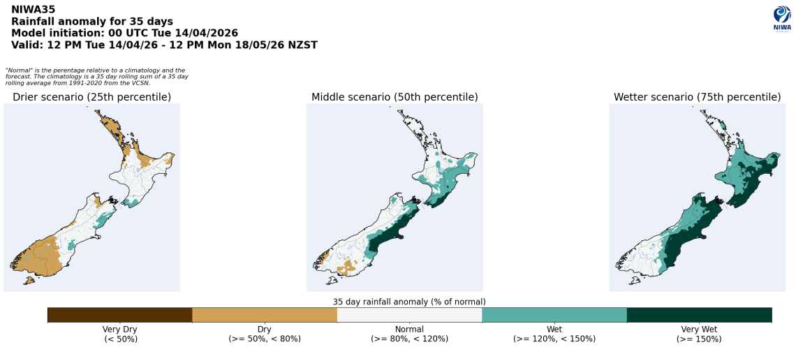 - In the drier (25th percentile) scenario, drier than normal conditions are signalled for the south and southwest of the South Island, parts of Tasman, and much of the upper North Island, with wet conditions for lower Wellington and parts of North Canterbury, and near normal conditions elsewhere.