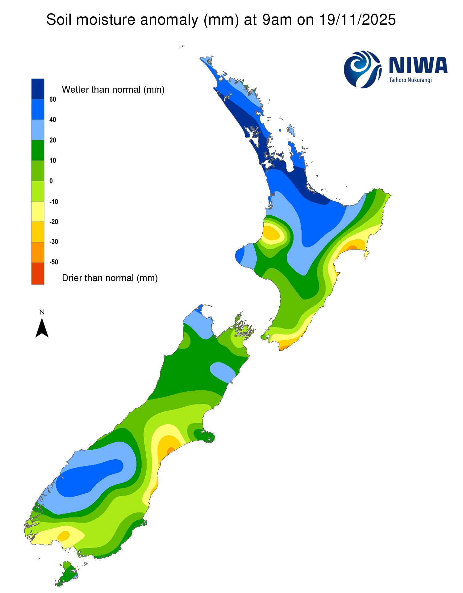 Please note: some hotspots in the text above may not correspond with the NZDI map. This difference exists because the NZDI uses additional dryness indices, including one which integrates the rainfall deficit over the past 60 days. Changes are therefore slower to appear in the NZDI compared to soil moisture anomaly maps that are instantaneously updated.