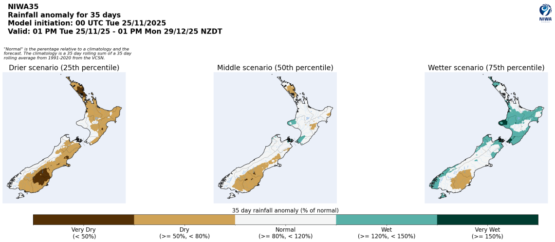 - The drier (25th percentile) rainfall scenario shows widespread below normal rainfall, especially in lower South Island and the top of the North Island, with areas of very dry conditions.