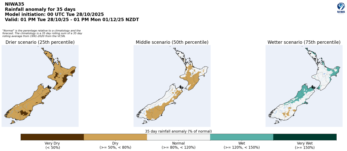 - The drier (25th percentile) rainfall scenario shows below normal rainfall across all of New Zealand, with very dry conditions for the east of both the North Island and South Island.