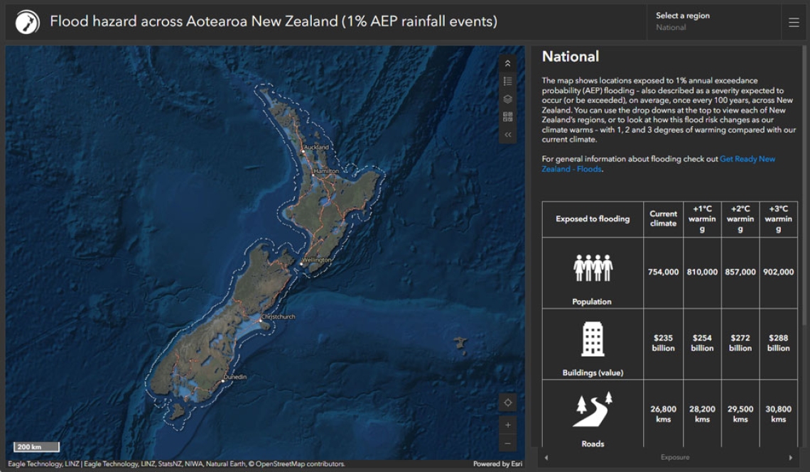 The new GIS viewer for flood hazard across Aotearoa New Zealand (1% AEP rainfall events) is available at: https://niwa.maps.arcgis.com/apps/dashboards/8c1db2b8e37841f29a57a38675388897
