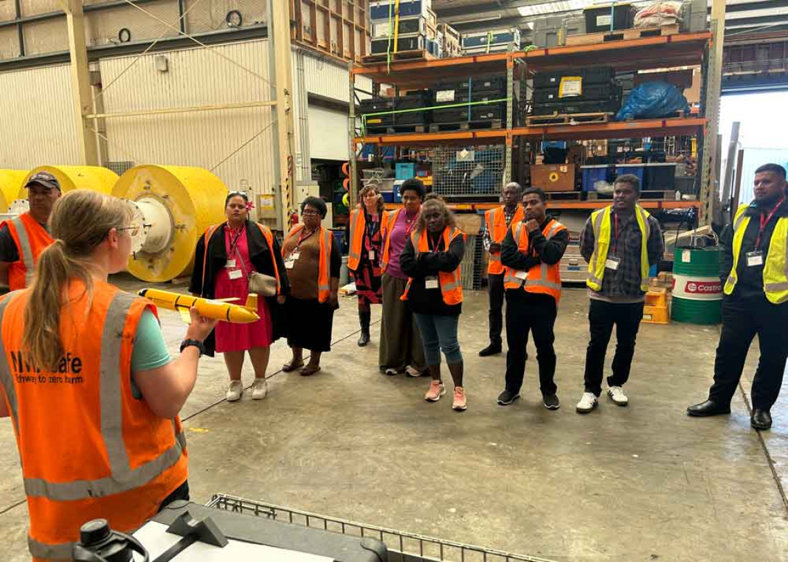 Pacific tour groups visit the National Geohazards Monitoring Centre at Avalon (left) and the Marine Deployments Workshop at Greta Point (right).