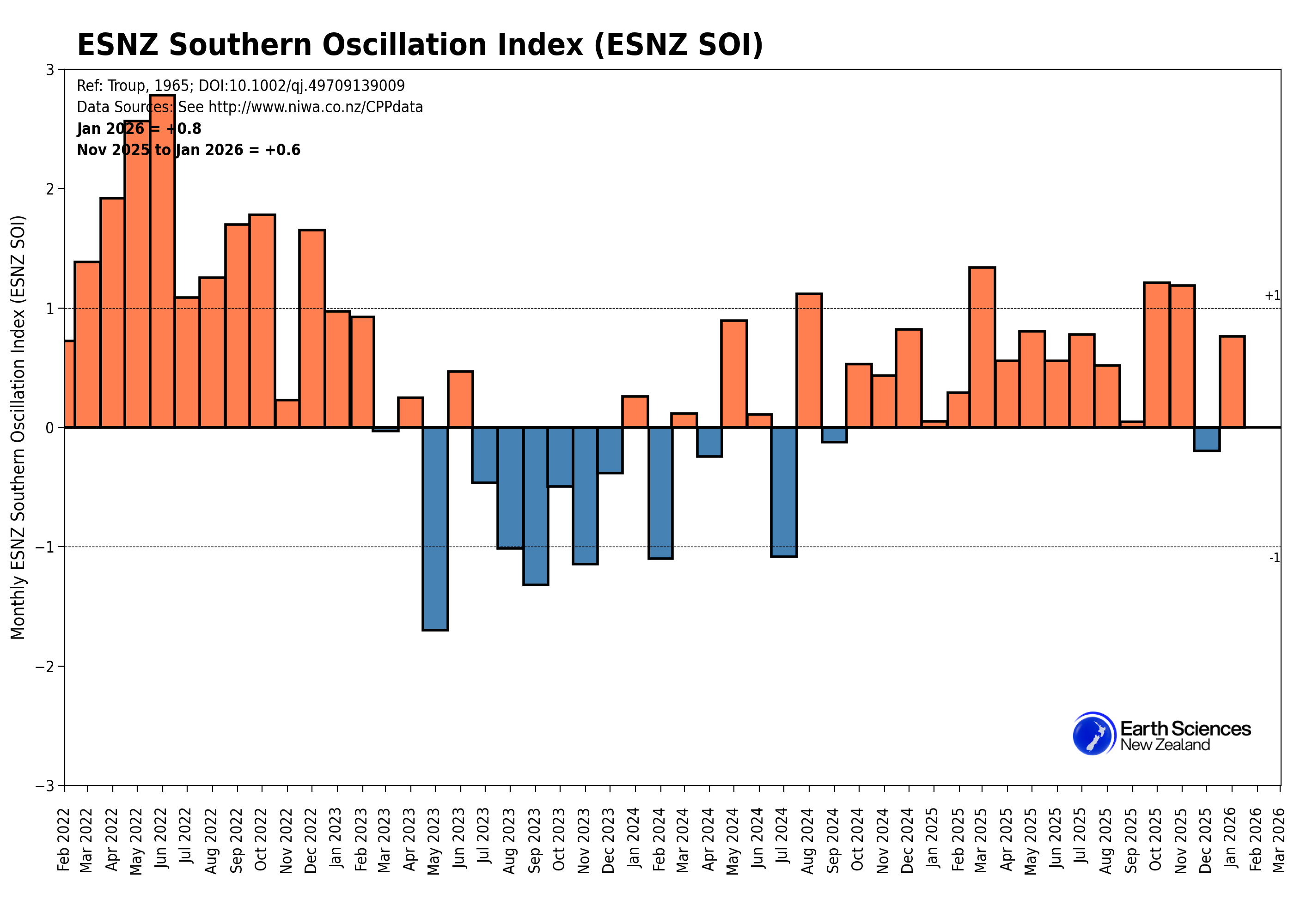The Southern Oscillation Index (SOI) was negative during March (preliminary value of -0.7), although not as persistently negative as in February. Typically, SOI values below -1.0 for three consecutive months indicate El Niño –the current El Niño event has not reached this conventional threshold. This could be the result of the central-based El Niño event influencing the synoptic pressure patterns near Darwin and Tahiti away from what might be considered conventional. For now, a weakly coupled central-based El Niño remains present.