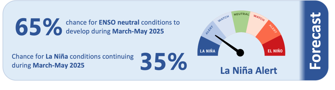 The ocean and atmosphere are in a weak La Niña state that will likely be brief, primarily focused on the central Pacific (i.e., La Niña “Modoki”). There is a 35% chance that La Niña will continue through March-May 2025 and a 65% chance that ENSO-neutral conditions will return.