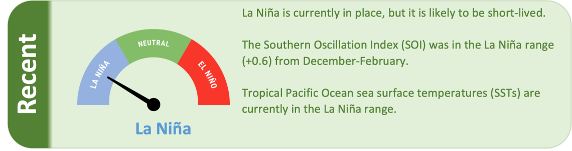 The Southern Oscillation Index (SOI) was in the La Niña range during December-February (+0.6), while the February value was +1.0 (in the La Niña range).