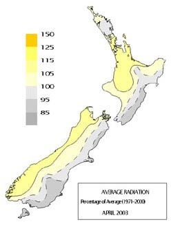 Sunshine and solar radiation totals were above average (about 110 percent of normal) in the west from Northland to Fiordland, as well as in Nelson. Duller than normal conditions prevailed in many eastern regions from Hawke’s Bay to Southland.