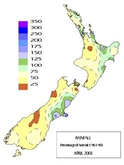 Extremely low rainfall, about 33 percent (a third) of average, occurred in most of the South Island west coast and some alpine areas. It was also dry, with rainfall less than 50 percent (half) of average in most other western regions from Waikato to Fiordland, as well as in central Wairarapa, Wellington, central Marlborough, Otago and Southland. Totals were also below average in south Auckland, Taranaki, and King Country. Significant soil moisture deficits continued throughout the east of the South Island, from south Canterbury to Central Otago, as well as in the southwest North Island from Wanganui to the Kapiti coast. In contrast, rainfall was above average in the Bay of Islands, parts of Auckland, Coromandel, areas of Bay of Plenty, southern Marlborough, Banks Peninsula and coastal Canterbury.