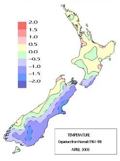 - The lowest air temperature for the month was –6.3°C, recorded at Tara Hills (Omarama) on the 25th, a new record low temperature extreme for April there in records going back to 1950.