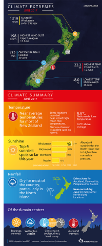 - Of the six main centres in June 2017, Auckland was the warmest, Tauranga was the sunniest, Christchurch was the coldest, driest and least sunny, and Wellington was the wettest.