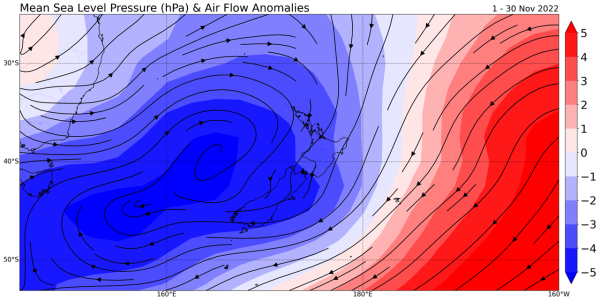 November 2022 was characterised by lower-than-normal mean sea level pressure (MSLP) over Aotearoa New Zealand, with a strong area of higher-than-normal MSLP to the east. This pressure setup resulted in northerly air flows being more common than normal, drawing warm and moist air from the sub-tropics and tropics across the country. Sea surface temperatures near New Zealand were also exceptionally warm; 1.1-1.7˚C above average. These factors, combined with an active sub-tropical jet stream, led to an increase in the frequency and intensity of low pressure systems, heavy rainfall events and thunderstorm outbreaks.