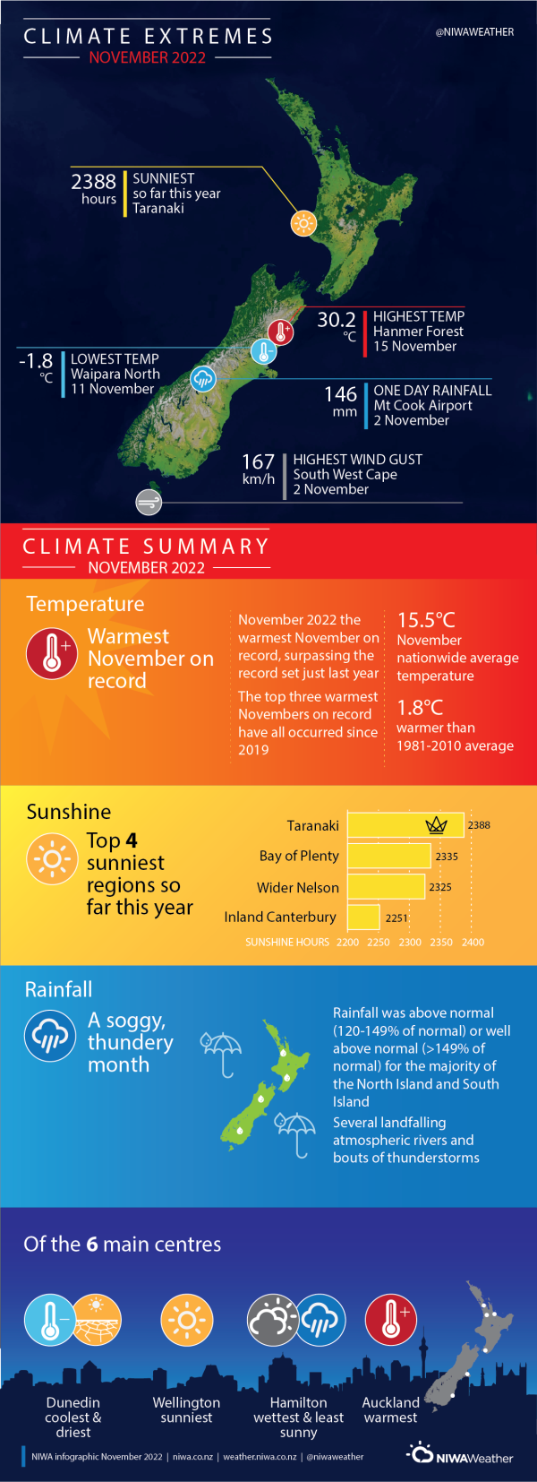 - Of the six main centres in November 2022, Auckland was the warmest, Dunedin was the coolest and driest, Hamilton was the wettest and least sunny, and Wellington was the sunniest.