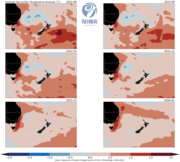 Disclaimer: The forecasts offered in this page draw upon modified Copernicus Climate Change Service Information [2022](C3S, https://climate.Copernicus.eu). There is inherent uncertainty in forecasting sea surface temperature and neither NIWA nor the licensors of the C3S products (being the European Union represented by the European Centre for Medium-Range Weather Forecasts) make any representations or warranties as to the information and figures on this page. Neither NIWA nor the licensor of the Copernicus products accept any liability for any loss or damage incurred by anyone from use or reliance on the information or figures.