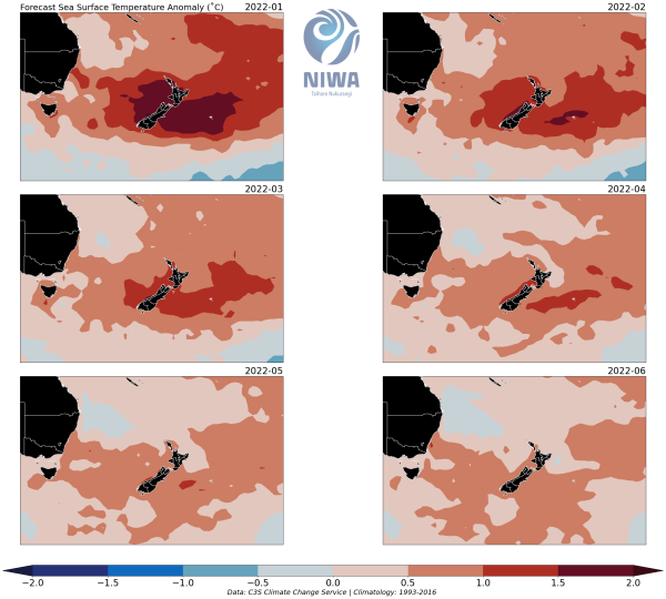 Disclaimer: The forecasts offered in this page draw upon modified Copernicus Climate Change Service Information [2022](C3S, https://climate.Copernicus.eu). There is inherent uncertainty in forecasting sea surface temperature and neither NIWA nor the licensors of the C3S products (being the European Union represented by the European Centre for Medium-Range Weather Forecasts) make any representations or warranties as to the information and figures on this page. Neither NIWA nor the licensor of the Copernicus products accept any liability for any loss or damage incurred by anyone from use or reliance on the information or figures.