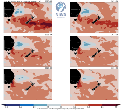 Disclaimer: The forecasts offered in this page draw upon modified Copernicus Climate Change Service Information [2022](C3S, https://climate.Copernicus.eu). There is inherent uncertainty in forecasting sea surface temperature and neither NIWA nor the licensors of the C3S products (being the European Union represented by the European Centre for Medium-Range Weather Forecasts) make any representations or warranties as to the information and figures on this page. Neither NIWA nor the licensor of the Copernicus products accept any liability for any loss or damage incurred by anyone from use or reliance on the information or figures.