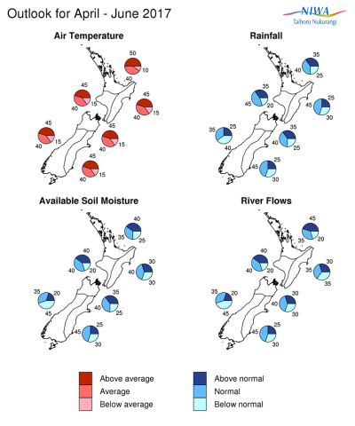 April – June 2017 rainfall totals are about equally likely to be above normal (40% chance) or near normal (35% chance) in the north of both Islands. Conversely, rainfall is about equally likely to be below normal (40% chance) or near normal (35% chance) in the west of the South Island. For other regions, near normal rainfall is the most likely outcome (45% chance).