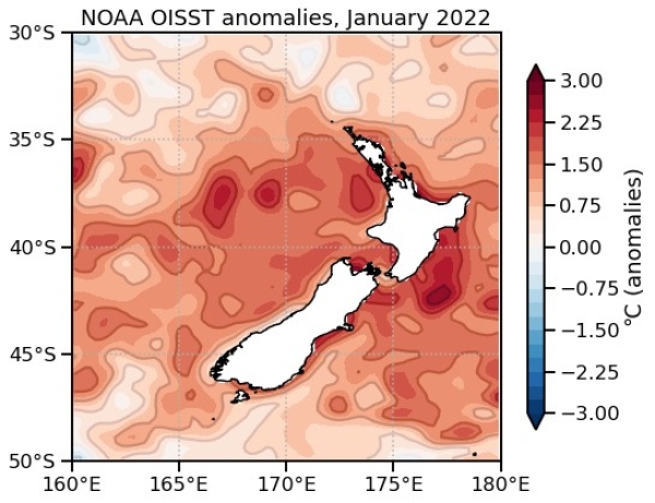 - Aotearoa New Zealand’s coastal waters continued to experience marine heatwave (MHW) conditions during January. Sea surface temperatures (SSTs) ranged from 0.9˚C to 1.9˚C above average. MHW conditions will continue to have an upward influence on air temperatures and humidity. Climate model guidance suggests the MHW will gradually ease during autumn.