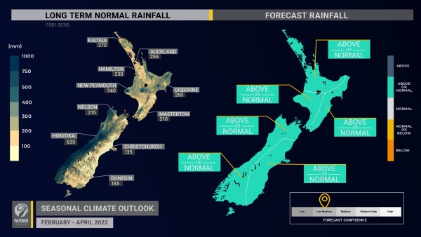 - Rainfall is about equally likely to be near normal or above normal in all regions of the country. For the north and west of the South Island in particular, the seasonal rainfall signal will be influenced by a heavy rain event in early February, increasing the risk for flooding. Moderate-to-heavy rain may affect the North Island during the second week of the month.
