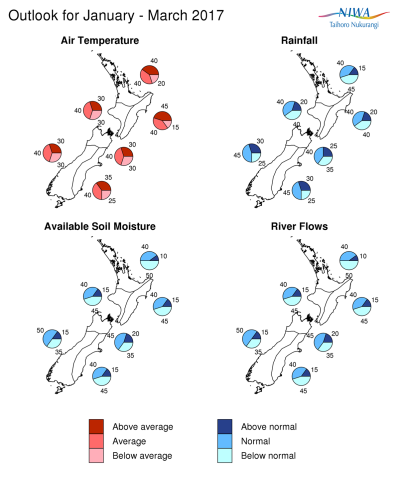 January – March 2017 rainfall totals are about equally likely to be near normal (40% chance) or below normal (40-45% chance) for all North Island regions. Rainfall totals are about equally likely to be near normal (40% chance) or below normal (35% chance) for the north of the South Island. Near normal rainfall is most likely (40% chance) for the east and west of the South Island.