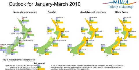 - The outlooks state the probability for above average conditions, average conditions, and below average conditions for rainfall, temperature, soil moisture, and stream flows. For example, for winter (June-July-August) 2007, for all the North Island, we assigned the following probabilities for temperature:
