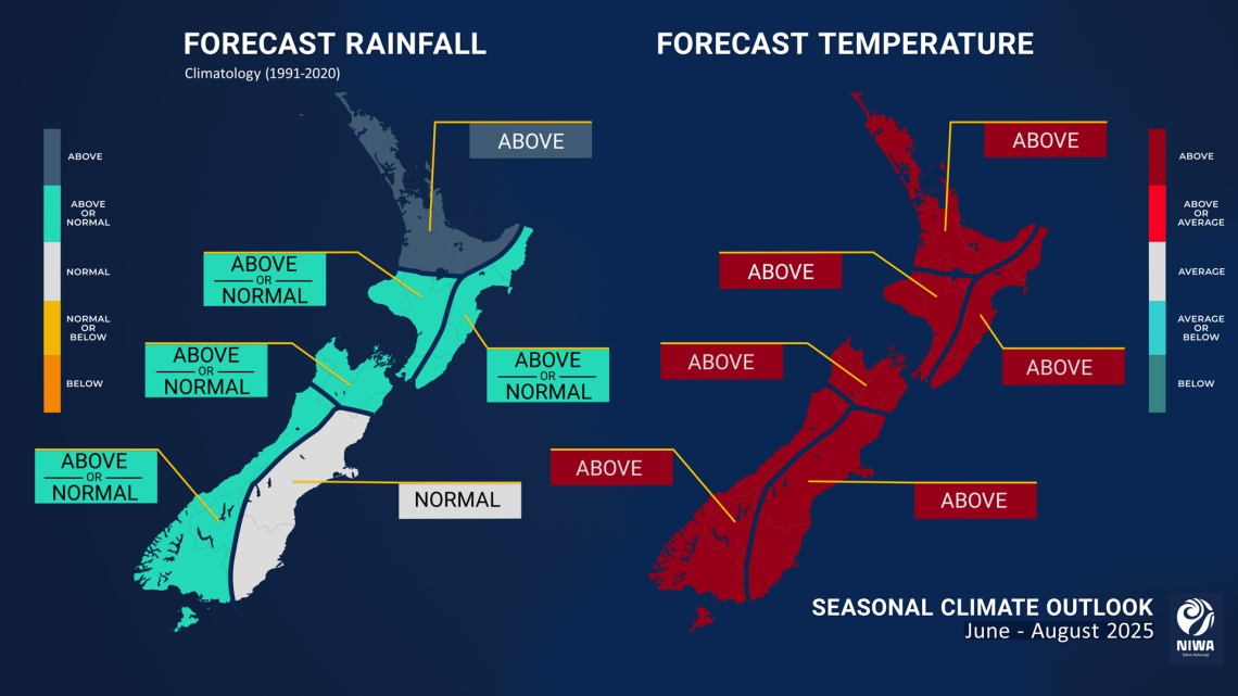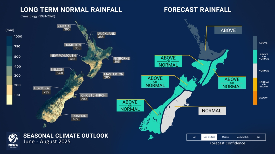 - During June – August 2025, near normal soil moisture levels and river flows are expected for all regions of the North Island, while near normal or above normal soil moisture levels and river flows are forecast for the South Island.