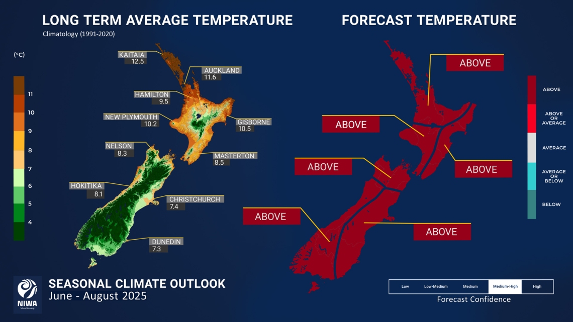 - Seasonal air temperatures are expected to be above average across all New Zealand regions for this winter season. Thus, while cold snaps and frost will occur, they are expected to be less frequent than usual.
