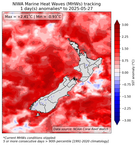 - Sea surface temperatures (SSTs) remain well above average around most of New Zealand, except in offshore areas east of the North Island. In May, coastal SST anomalies ranged from +0.39°C to +1.47°C. Large regions offshore are currently experiencing Marine Heatwave (MHW) conditions. Global climate models suggest that SSTs in the New Zealand region are likely to stay above average over the next three months, although the intensity of the anomalies may ease. Monitor the SST update for updates.