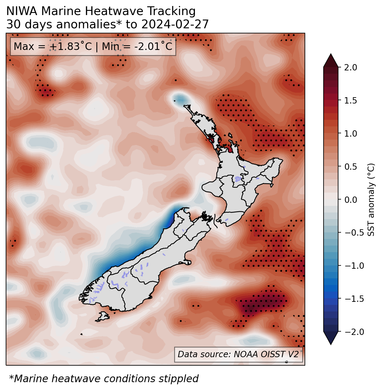 - Coastal sea surface temperatures (SSTs) ranged from 0.32˚C below average to 0.63˚C above average during February. Marine heatwaves eased during February, aside from in parts of the northern and eastern North Island.