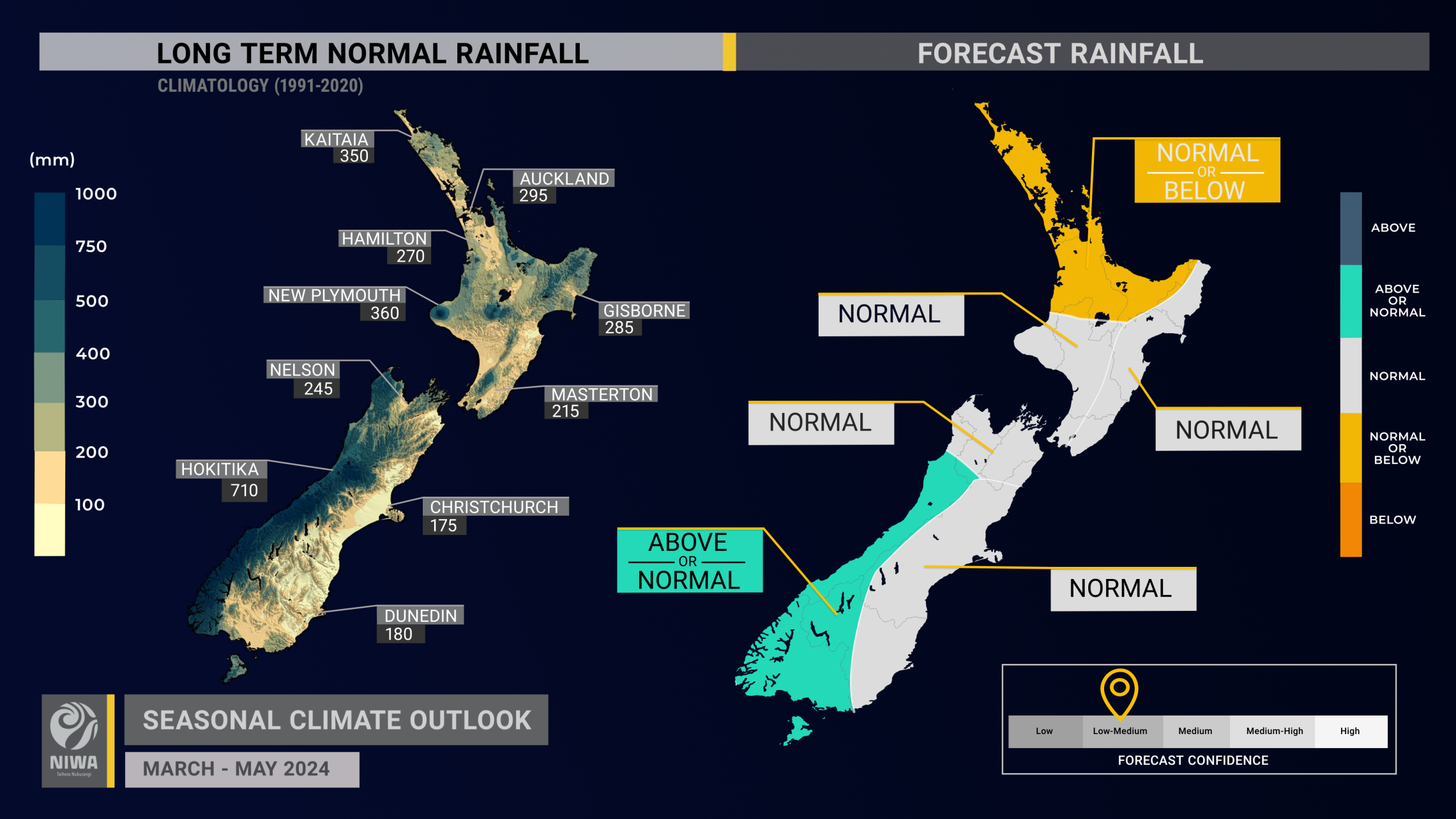 - Although seasonal rainfall may return to normal for several regions, including those that experienced below normal rainfall in recent months, rainfall events will likely occur irregularly through autumn. Monitor NIWA35 for updates.