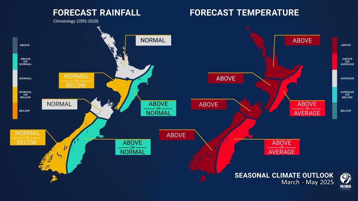 - March – May 2025 soil moisture levels and river flows are about equally likely to be near normal or below normal in all regions of New Zealand, except for the east of the South Island, where near normal soil moisture levels and river flows are likely.
