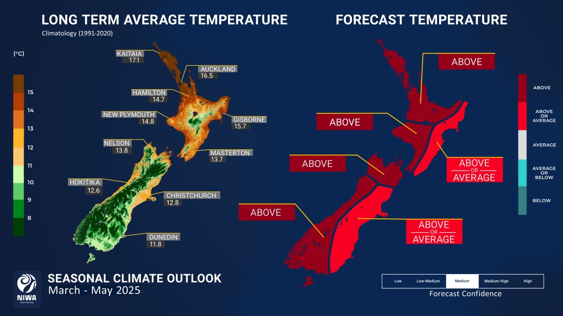 - Seasonal air temperatures are expected to be above average for the north and west of both Islands, with about equal chances for near average or above average seasonal temperatures for the east of the North Island and the east of the South Island. However, as the season progresses, the threat of frosts will increase.