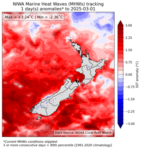 Ocean waters remained much warmer than normal in February 2025 around the South Island, and Marine Heat Wave conditions (five or more consecutive days above the climatological 90th percentile) are present over extended areas off the west and east coasts of the South Island, as well as in Cook Strait. Model guidance generally suggests that near normal to abovenormal ocean temperatures are likely, especially around the South Island, during the March – May 2025 period, i.e. the current SST anomaly pattern is expected to persist. NIWA will continue to monitor the situation in the SST update.
