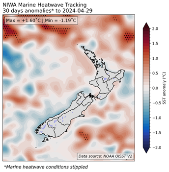 SSTs in New Zealand’s coastal waters were generally near average during April. Near average SSTs are favoured in the months ahead, although a subtle warming trend may occur (relative to average for the time of year). For more info, see the NIWA Sea Surface Temperature Update.
