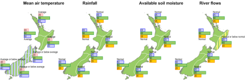 - The outlooks state the probability for above average conditions, average conditions, and below average conditions for rainfall, temperature, soil moisture, and stream flows. For example, for winter (June-July-August) 2007, for all the North Island, we assigned the following probabilities for temperature:
