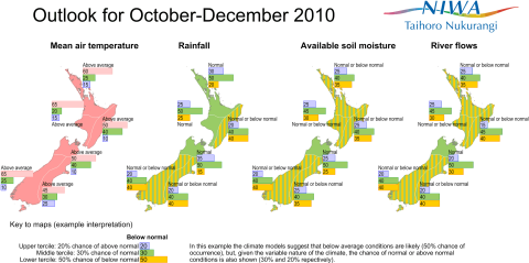 Late spring (October–December) temperatures are likely to be above average, in all regions. Rainfall is likely to be near normal or below normal in the east of both islands and the southwest of the South Island, and near normal elsewhere, averaged over the three month period October–December.