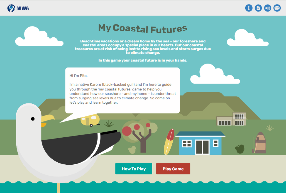 My Coastal Futures was developed by NIWA, alongside Hum Interactive and Geo AR Games, to help people understand climate change impacts and start thinking about how they might adapt. It provides players with the experience of making decisions about their coastal property as the sea level rises.