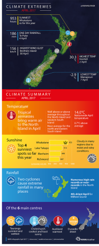 Widespread heavy rainfall was the flavour of the month for the majority of the North Island along with the north and east of the South Island. Most locations received the bulk of their April rainfall during two distinct events; the passage of the remnants of Cyclone Debbie during 4-5 April and the arrival of ex-Cyclone Cook during 12-13 April. These storms both brought heavy rain and flooding to much of the North Island and parts of the South Island. Cook also brought high winds to the eastern North Island, resulting in downed trees and power outages. The impacts of these significant rainfall events are covered in more detail in the Highlights and Extreme Events section.