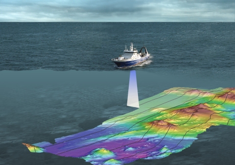 Multibeam echo sounders emit a fan of sound beams to the seafloor to scan a wide swath of the seabed in great detail. Compared with conventional echo sounders – which direct a single beam of sound to the seabed directly below a ship – multibeams show more detail and greatly reduce ship survey time and cost.