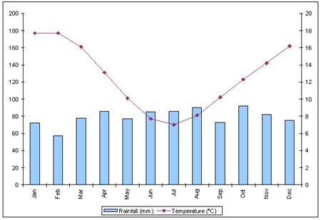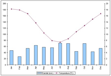 As much of this climate zone is sheltered by high country to the west, south and in some areas to the east, it is the sunniest region of New Zealand. Warm, dry and settled weather predominates during summer. Winter days often start with a frost, but are usually mild overall. Typical summer daytime maximum air temperatures range from 20°C to 26°C, but occasionally rise above 30°C. Late winter and early spring is normally the most unsettled time of the year. Typical winter daytime maximum air temperatures range from 10°C to 15°C. Annual hours of sunshine average at least 2300 hours. Northnortheast winds prevail in Nelson, while southwesterlies prevail about Blenheim. Nelson has less wind than many other urban centres and its temperatures are often moderated by sea breezes. High temperatures are frequent in Blenheim and may be accompanied by foehn winds from the northwest.