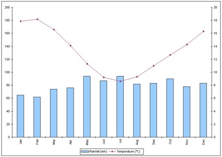 Because of its exposure to disturbed weather systems from the Tasman Sea, this climate zone is often quite windy, but has few climate extremes. The most settled weather occurs during summer and early autumn. Summers are warm. Typical summer daytime maximum air temperatures range from 19°C to 24°C, seldom exceeding 30°C. Winters are relatively mild in New Plymouth and Wanganui, but cooler in Palmerston North and Wellington. This is normally the most unsettled time of the year. Typical winter daytime maximum air temperatures range from 10°C to 14°C. Frost occurs inland during clear calm conditions in winter. Annual sunshine hours average about 2000 hours, but inland at Palmerston North it is much cloudier. Northwesterly airflows prevail. Sea breezes occasionally occur along the coast during summer.