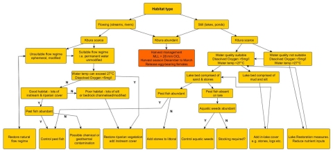 Several abiotic (habitat) and biotic (biological) factors can affect the abundance of kōura populations in New Zealand these include: water flow, water temperature, water quality, habitat structure (cover), and predation. One or more of these three factors may affect your waterway and reduce kōura numbers. This kōura decision support system (DSS) can help identify the main causes of low kōura abundance in New Zealand waterways.