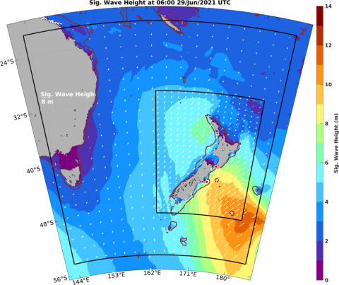 The image above shows NIWA’s wave forecast domains and wave height in the Southwest Pacific at 6UTC June 29, 2021 (as an example). Significant wave height (m) is shown as a rainbow shade (warm colours = larger waves), while arrows in every 40th grid cell of each model domain show wave direction, with their length proportional to wave height. In this simulation the model uses input wind data sourced from our NZLAM and NZCSM weather forecast models.