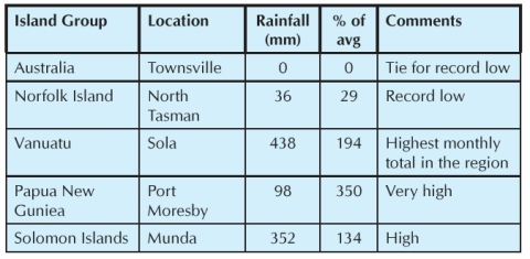 Warmer than normal conditions occurred as a whole across French Polynesia during August, with +0.6°C to +1.4°C above normal temperatures recorded. A new monthly mean temperature was also recorded for August at Tahiti. Maximum and minimum temperatures were also near or above normal for many other locations across the south Pacific. In New Zealand, it was the warmest August since records began 155 years ago.