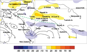Outgoing Long-wave Radiation (OLR) anomalies, in Wm2 are represented by hatched areas. High radiation levels (yellow) are typically associated with clearer skies and lower rainfall, while cloudy conditions lower the OLR (blue) and typically result in higher rainfall. The August 2009 position of the South Pacific Convergence Zone (SPCZ) could not be determined by OLR anomalies. Based on TRMM analysis, it was less coherent compared to previous months. The average position of the SPCZ is identified by the dashed green line, which is based on mean January rainfall for the South Pacific. Mean sea level (MSL) pressure anomalies (in hPa) are shown as solid and dashed black lines.