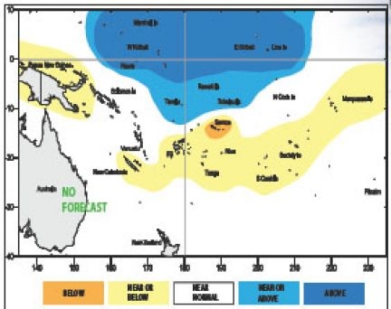 A region of suppressed convection is likely in the southwest Pacific encompassing Samoa, Niue, Tonga, Fiji, New Caledonia, the Southern Cook Islands, the Society Islands, the Austral Islands and Papua New Guinea. Near to below average rainfall is expected for all of those islands, except for Samoa, which is expected to receive below average rainfall. Near normal rainfall is forecast for the Northern Cook Islands, the Tuamotu Archipelago, and Pitcairn Island. Enhanced convection is likely along the Equator extending from Western to Eastern Kiribati, with an expectation of above normal rainfall. Near or above normal rainfall is also forecast for Tokelau and Tuvalu. No clear precipitation guidance is offered for Vanuatu, Wallis and Futuna, and the Solomon Islands.