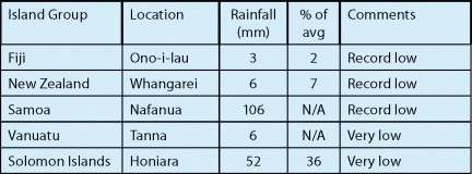 Enhanced convection along a partially southwest displaced South Pacific Convergence Zone (SPCZ) were seen near northern Vanuatu, northern Queensland, and the eastern edge of Papua New Guinea during November. Most of the region reported well below normal rainfall during the month. Suppressed convection existed in the central portion of the southwest Pacific, particularly around Fiji, southern Vanuatu and New Caledonia. The regional circulation in November was characterised by more frequent low pressure to the southeast of the Society Islands and higher than normal pressure to the northwest of New Zealand and over Australia. This pattern resulted in more frequent easterly and southeasterly anomalies across the much of southwest Pacific, and southerly flow entering the region from the east of New Zealand. Easterly anomalies were particularly evident across Fiji, Vanuatu, and New Caledonia.