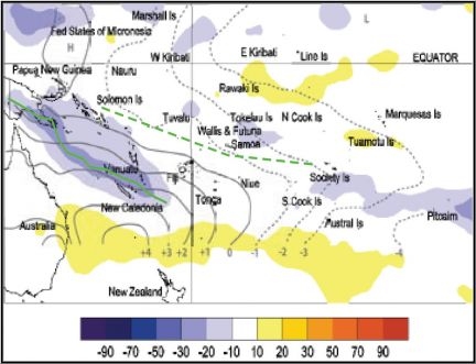 Outgoing Long-wave Radiation (OLR) anomalies, in Wm2 are represented by hatched areas. High radiation levels (yellow) are typically associated with clearer skies and lower rainfall, while cloudy conditions lower the OLR (blue) and typically result in higher rainfall. The November 2009 position of the South Pacific Convergence Zone (SPCZ) southwest of normal near the Solomon Islands, but was incoherent west of Fiji. The average SPCZ position is identified by the dashed green line, which is based on mean January rainfall for the South Pacific. Mean sea level (MSL) pressure anomalies (in hPa) are shown as solid and dashed black lines.