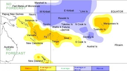 During January – March 2010, a region of suppressed convection is likely in the southwest Pacific encompassing The Marquesas, Niue, Fiji, Tonga and Vanuatu. Below average rainfall is expected for all of those island groups. Near or below normal rainfall is expected for Wallis & Futuna, New Caledonia, the Southern Cook Islands, and the Solomon Islands. Enhanced convection is likely along the Equator extending from Western to Eastern Kiribati, and also near Tuvalu and the Society Islands, with an expectation of above average rainfall for those islands. Near or above average rainfall is forecast for the Northen Cook Islands, the Tuamotu Archipelago and Tokelau. Near normal rainfall is forecast for Papua New Guinea, Pitcairn Island, Samoa, and the Austral Islands.