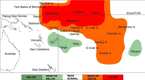 The global models are continuing to show elevated temperatures in the near equatorial Pacific and the northeast part of the Southwest Pacific. A warm pattern is seen in many models for French Polynesia while cold anomalies are projected around Fiji. Above average sea surface temperatures are forecast for Eastern and Western Kiribati. A region of near or above average sea surface temperatures is forecast around Tokelau, Tuvalu, the Northern Cook Islands, and all of French Polynesia. Average or below average SSTs are forecast for Fiji, Niue, Tonga, and Pitcairn Island. Near normal SSTs are forecast for the remainder of the southwest Pacific.