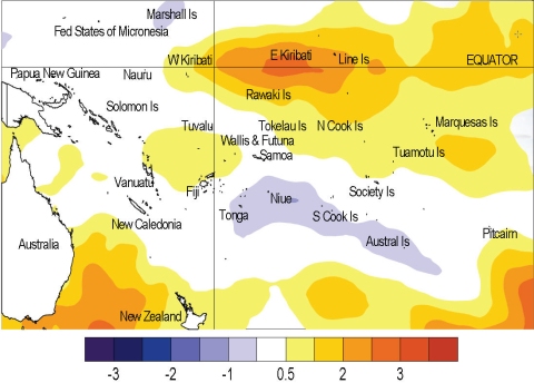 Moderate El Niño conditions exist in the equatorial Pacific. The Southern Oscillation Index (SOI) strengthened considerably in recent weeks, with a February mean of around –2.0 (roughly double the magnitude of the January value). Low-level westerly wind anomalies have been evident in February, especially over the western Pacific. However, Equatorial sea surface temperature anomalies have weakened recently. The NINO3 anomaly fell by about half, to +0.7°C for February, and NINO4 decreased to +1.1°C (from +1.5°C). Upper ocean equatorial heat content anomalies have weakened recently, but a new pulse is evident in the central Pacific, centred near 150m depth. The MJO is weak at present, but is currently configured to reinforce the El Niño pattern, and may have strengthened the atmospheric ENSO signal recently. The MJO is expected to be slow moving but weak over the coming two weeks.